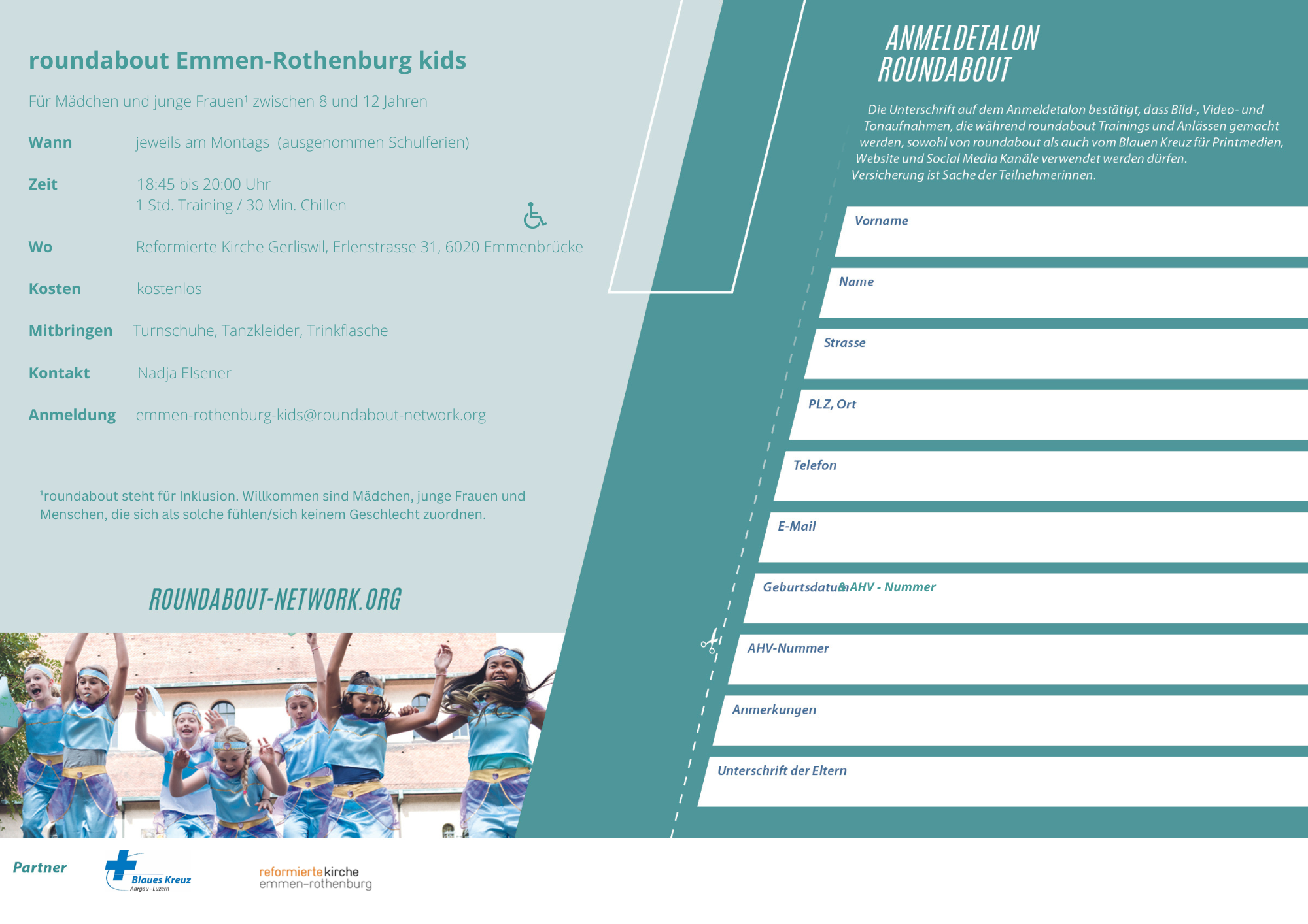 roundabout ist ein Tanz- und Präventionsangebot des Blauen Kreuzes Aargau und Luzern für Mädchen und junge Frauen. In wöchentlichen Treffen erleben die Teilnehmerinnen Tanz, Gemeinschaft und setzen sich mit aktuellen Themen auseinander, die sie in ihrem Alltag beschäftigen. Ziel des Angebots ist es, die Gesundheit und das Wohlbefinden der Mädchen zu fördern – sowohl körperlich als auch seelisch. Es sind keine Vorkenntnisse erforderlich und der Kurs ist kostenlos.