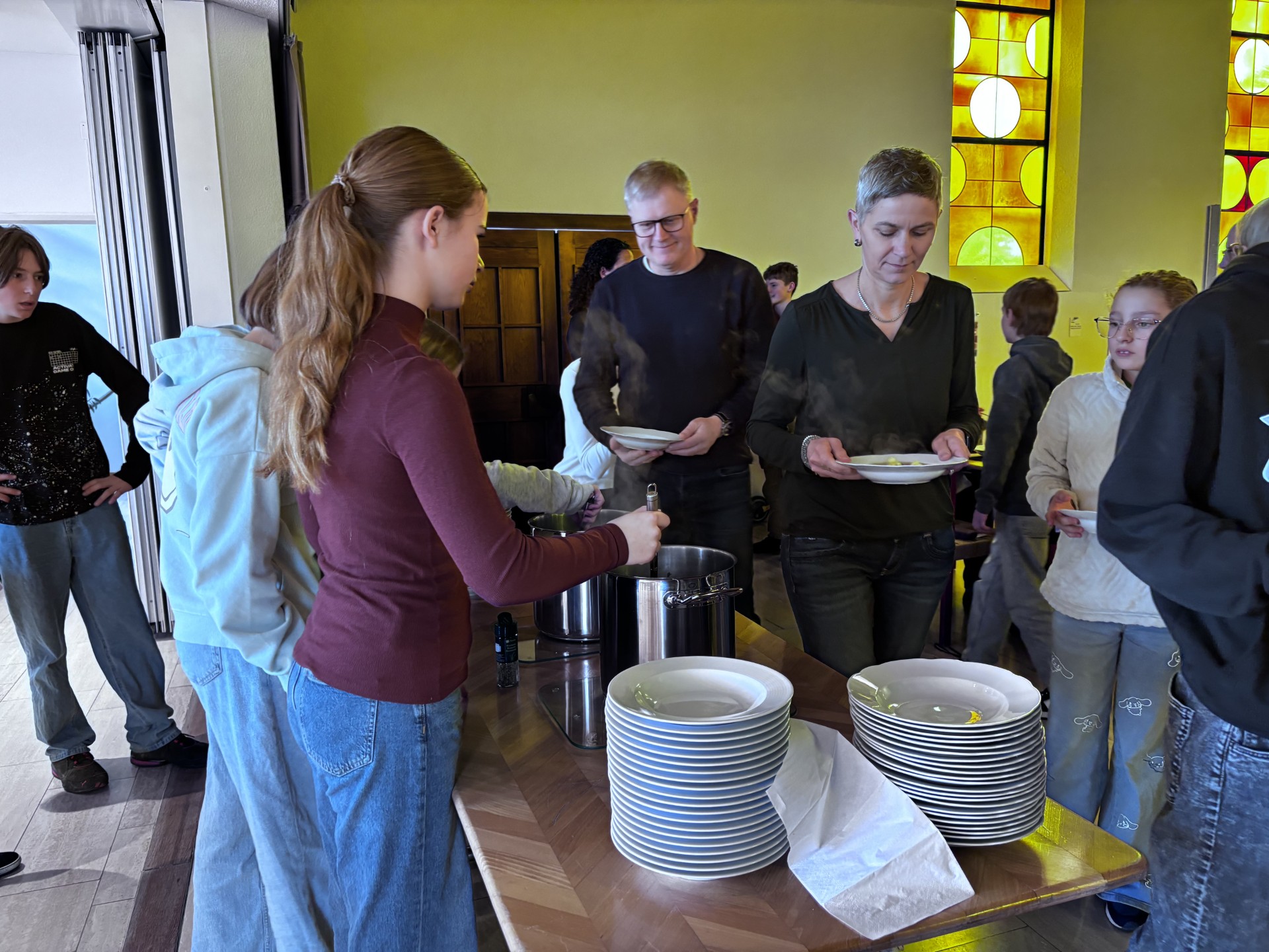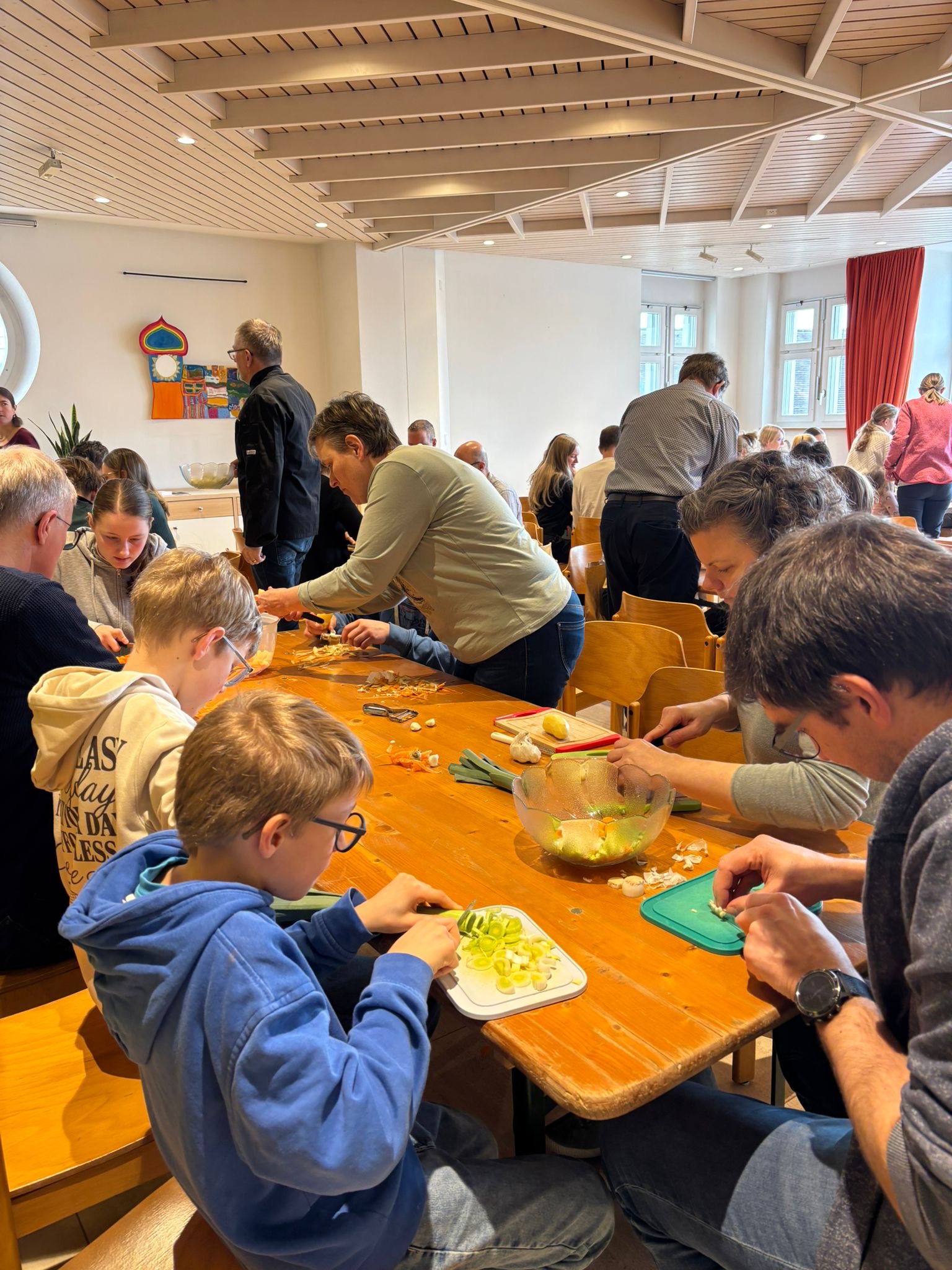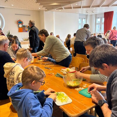 Der Suppentag gehört zum Kirchenjahr in der Schweiz wie Weihnachten und Ostern. Darum ist es wichtig ihn angemessen zu begehen. Im letzten Jahr sammelten wir Erfahrungen damit, die Suppe erst während des Gottesdienstes zu kochen und alle Besucherinnen zum Rüsten einzuladen. In diesem Jahr erwarteten wir eine grössere Zahl an Gästen, und darum waren alle Beteiligten aufgeregt, ob es wohl auch dieses Mal gelingen würde.