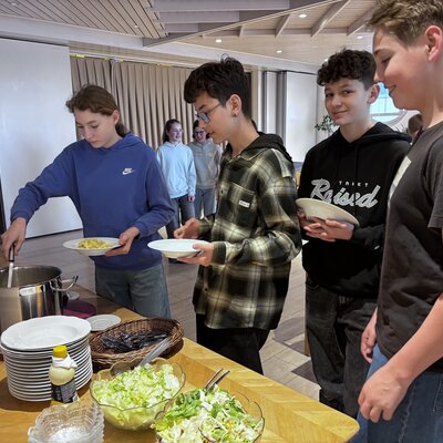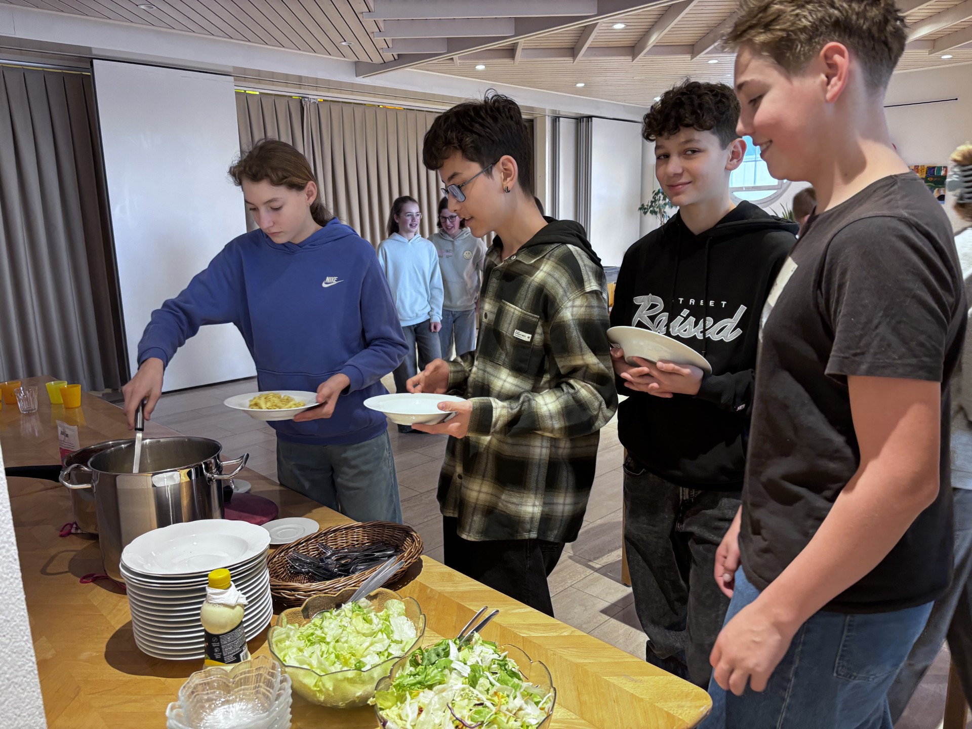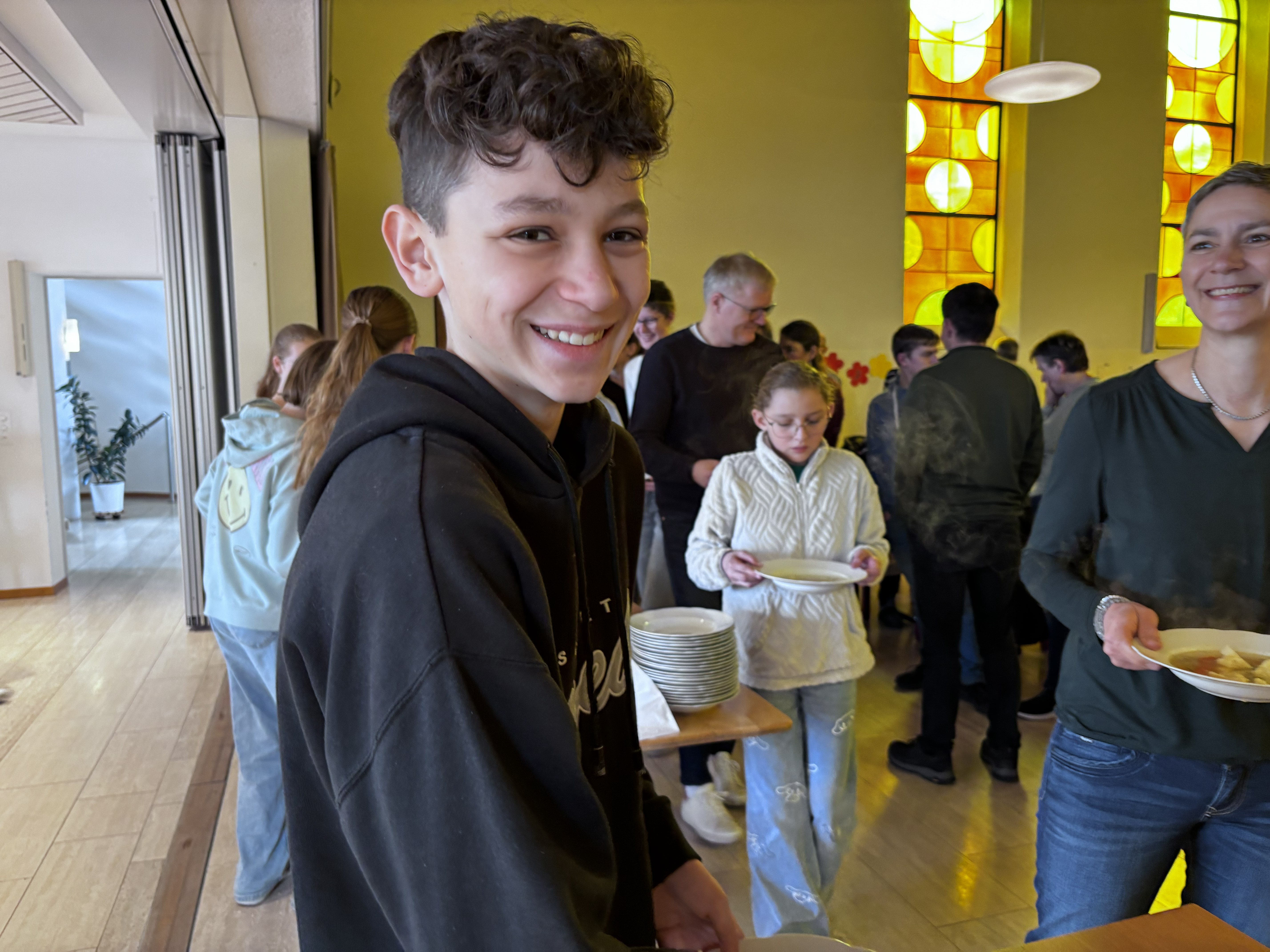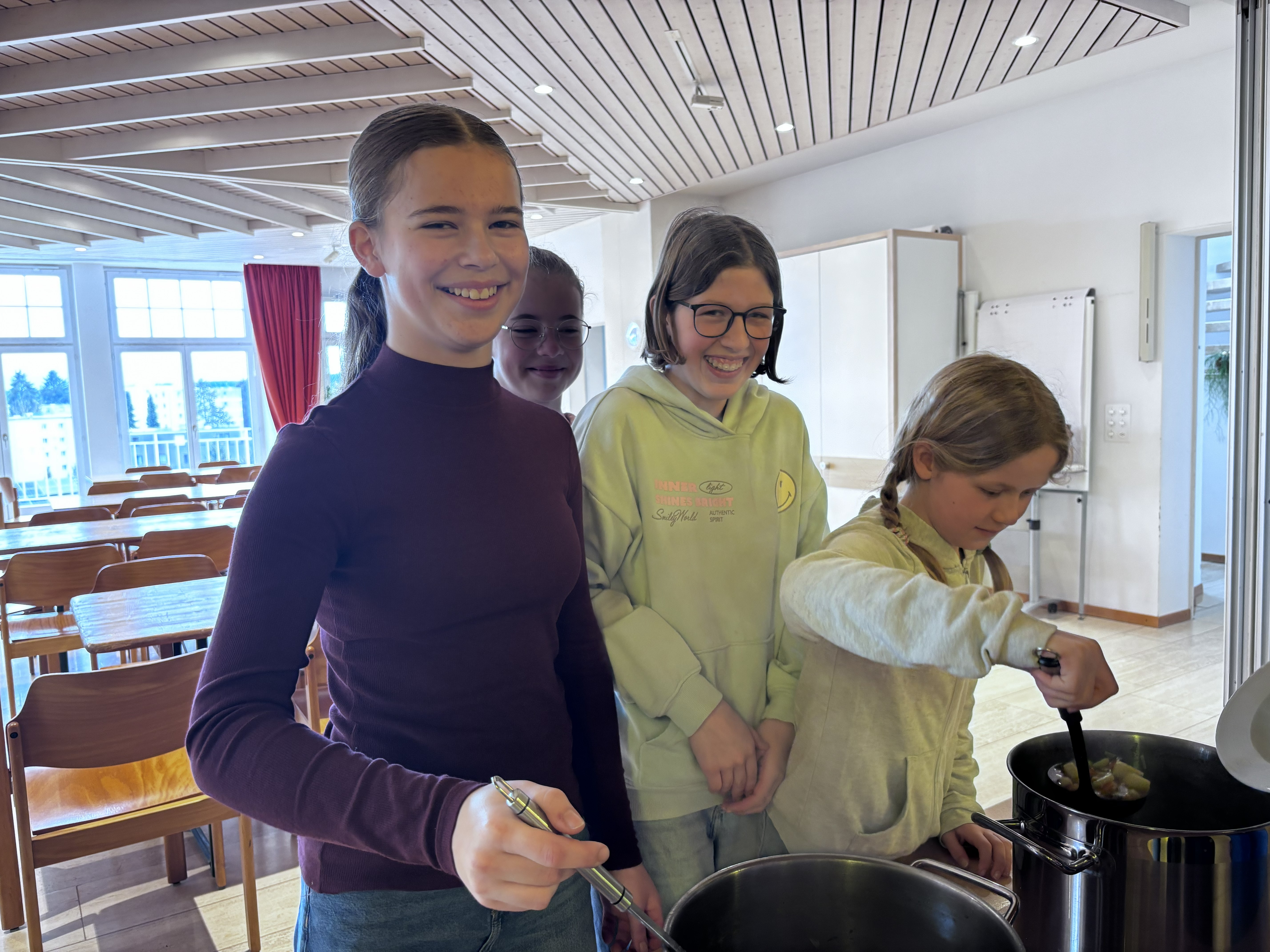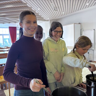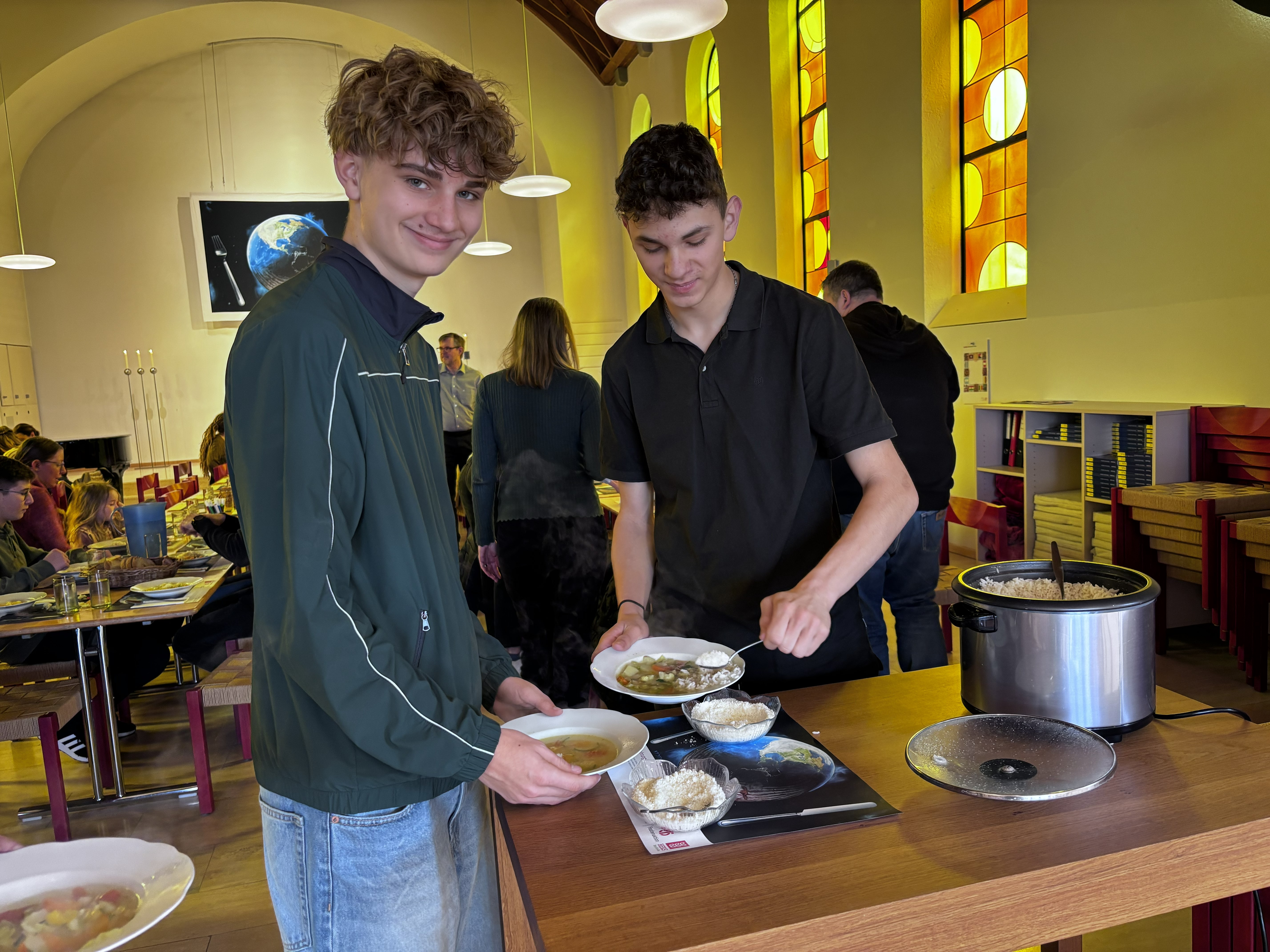 Und es klappte! Auch für 70 Personen! Um 12.15 Uhr waren Suppe und Reis servierfertig. Und die etwas längere Rüstphase wurde ganz entspannt überbrückt: Mit dem Verkauf von Wildblumensamen unseres Hilfswerkes HEKS durch die Schülerinnen und Schüler der 7. Klasse; mit Erläuterungen von Unterrichtsergebnisses zum Thema: Wir selbst sind der Samen. Am Unterrichtstag zuvor hatte die 7. Klasse mit den Katechetinnen Sophie Kallert und Simone Steiner ein Spiel zu Klimawandel und Nachhaltigkeit gespielt, an dessen Ende Tipps und Lösungsvorschläge standen.