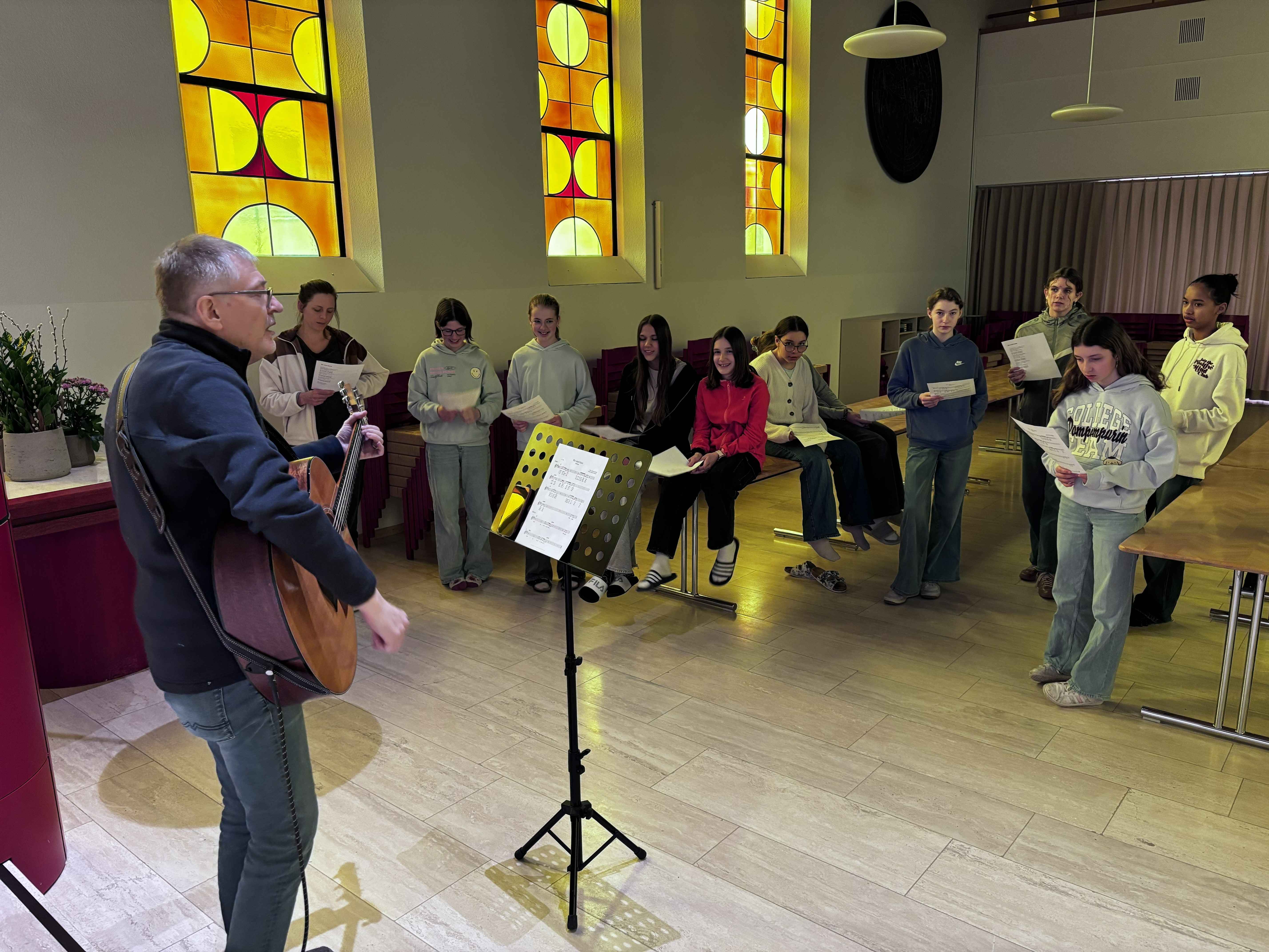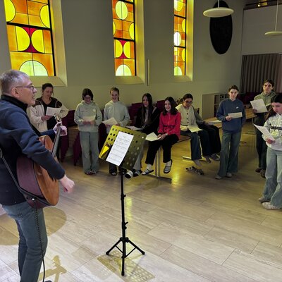Ein weiterer musikalischer Rahmen war das Lied des Tages, eine moderne Komposition mit dem Titel "Wir sind Gäste". Schnell wurde eine kleine Band zusammengestellt mit den Violinen, einer Gitarre und dem Cajon als Schlagzeug. Konfirmand Elias Emmenegger war so spontan, es zu bedienen und schüttelte den Rhythmus perfekt aus seinen Handgelenken.