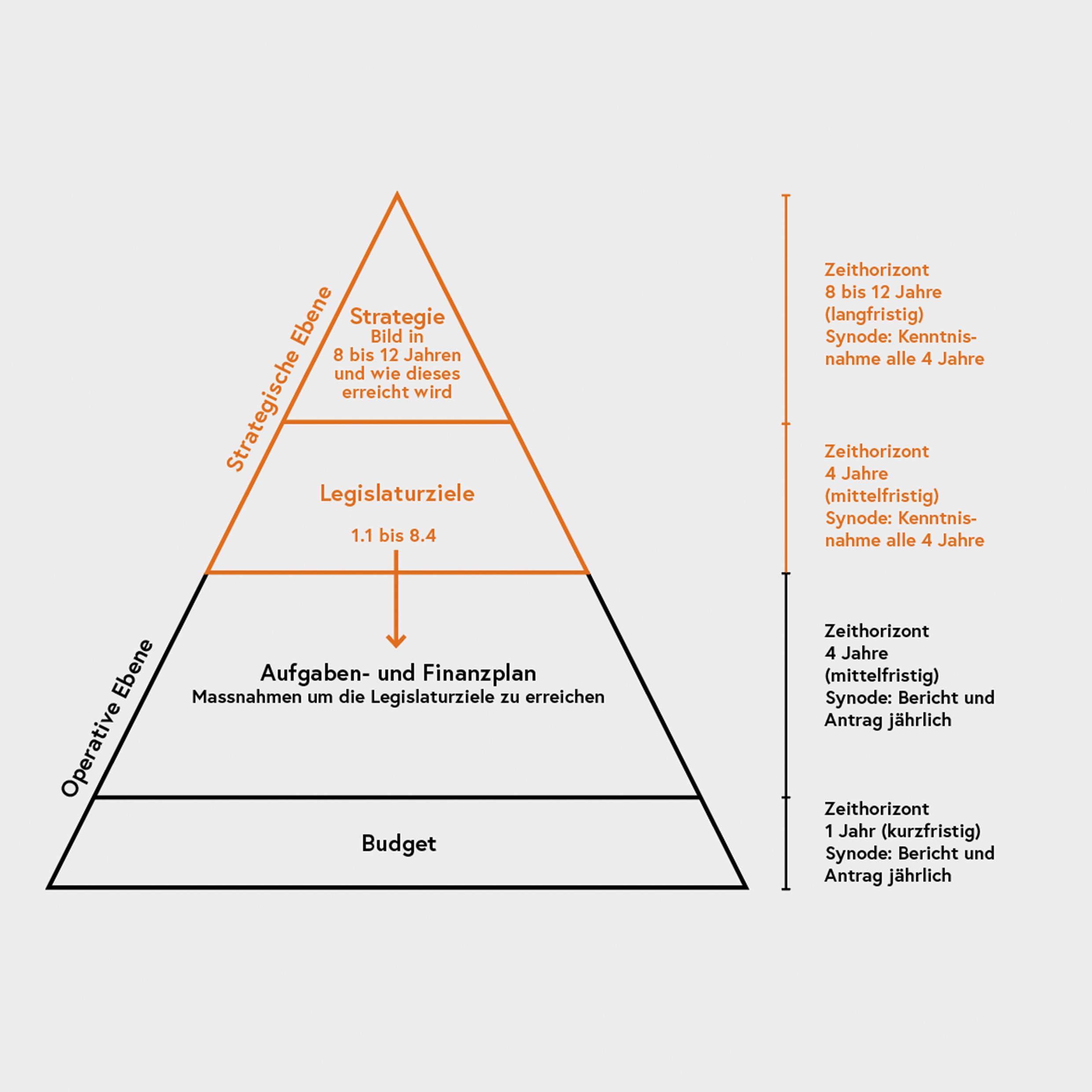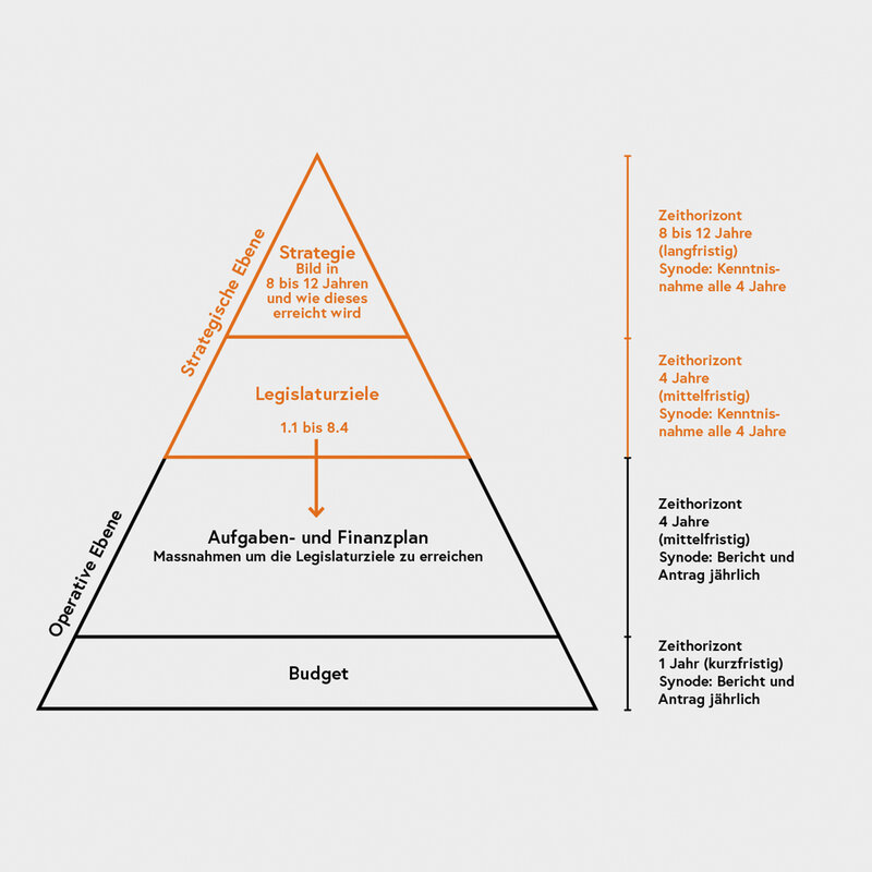 Die Strategie ist das langfristige Planungsinstrument des Synodalrats mit einem Zeithorizont von acht bis zwölf Jahren. Die Legislaturziele sind mittelfristig für einen Zyklus von vier Jahren vorgesehen. Für die neue Legislatur werden diese überprüft und wo nötig angepasst oder erweitert. Die jeweiligen Massnahmen und Projekte für die Erreichung der Ziele werden mittelfristig im Aufgaben- und Finanzplan (AFP) abgebildet. Das jährlich erstellte Budget dokumentiert dies und ist das kurzfristig abbildende Planungsinstrument, welches Bestandteil des AFP ist.