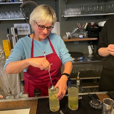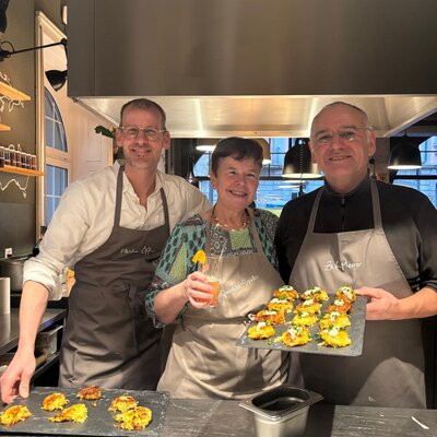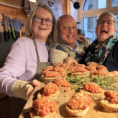Als Team bereiten wir verschiedenste Häppchen und Drinks vor – von feinem Fleischtatar bis hin zu selbstgemachten Rösti. Mit viel Engagement wird geschnippelt, angerichtet, gewürzt und gemixt. Während in der Küche konzentriert gearbeitet wird, klirren vorne bereits die ersten Gläser.