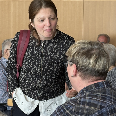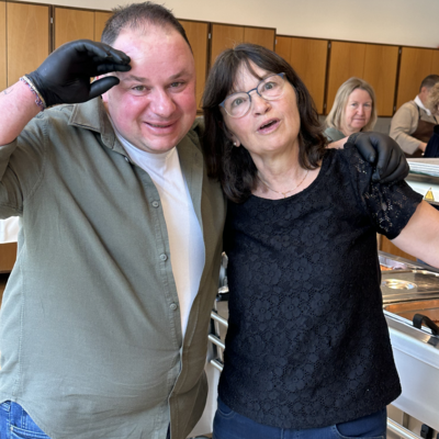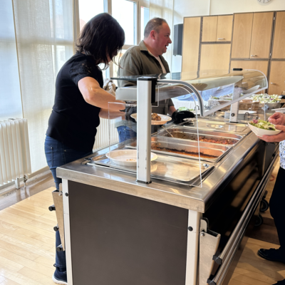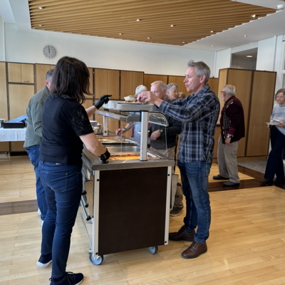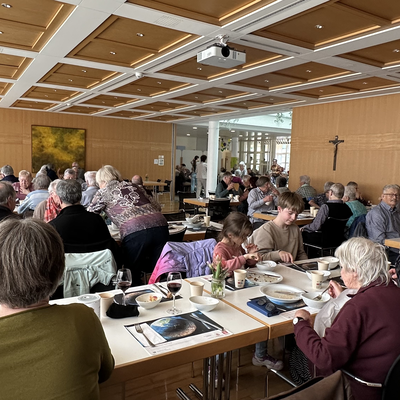 Im Anschluss an den Gottesdienst waren alle zum «Zäme am Tisch» im Feldheim eingeladen. Serviert wurden Lasagne mit Fleisch und Gemüse und Salat, welche von der Küchencrew des Feldheims vorbereitet wurde. Der Andrang war so gross, dass die Gäste zeitweise Schlange stehen mussten und die freiwilligen Helferinnen und Helfer ins Schwitzen kamen. Auch die Oberstufenschülerinnen und -schüler, die hier einen Sozialdienst leisteten, hatten alle Hände voll zu tun, alle Gäste mit Getränken zu versorgen. Dank der großartigen Infrastruktur des Feldheims, die unentgeltlich zur Verfügung gestellt wurde, und dem vollen Einsatz aller musste niemand hungrig nach Hause gehen. Die lange Warteschlange zeigte jedoch vor allem eines: Die Freude am gemeinsamen Essen und am Austausch waren gross.