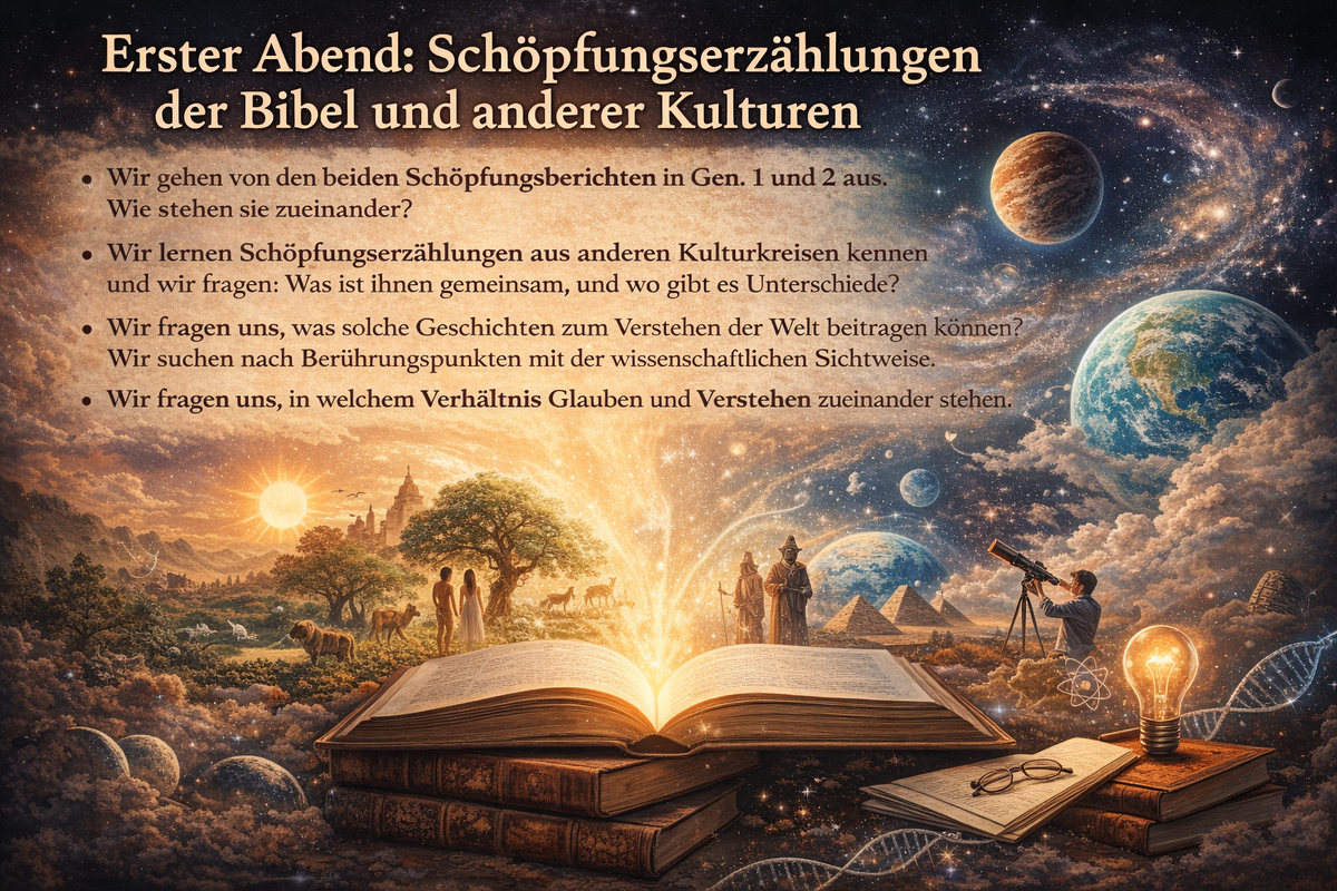 Erster Abend 19. März 2026: Schöpfungserzählungen der Bibel und anderer Kulturen: Wir gehen von den beiden Schöpfungsberichten in Gen. 1 und 2 aus. Wie stehen sie zueinander? Wir lernen Schöpfungserzählungen aus anderen Kulturkreisen kennen und wir fragen: Was ist ihnen gemeinsam, und wo gibt es Unterschiede? Wir fragen uns, was solche Geschichten zum Verstehen der Welt beitragen können? Wir suchen nach Berührungspunkten mit der wissenschaftlichen Sichtweise. Wir fragen uns, in welchem Verhältnis Glauben und Verstehen zueinander stehen.