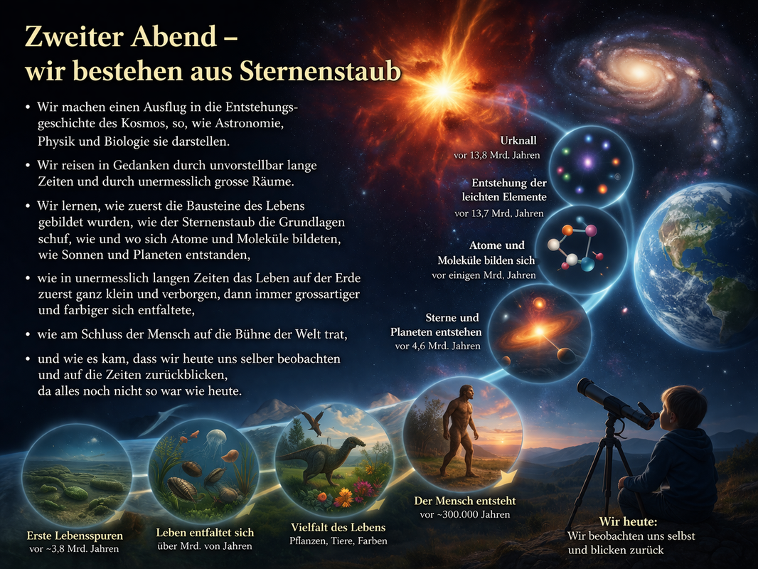 Zweiter Abend 16. April 2026 – wir bestehen aus Sternenstaub: Wir machen einen Ausflug in die Entstehungsgeschichte des Kosmos, so, wie Astronomie, Physik und Biologie sie darstellen. Wir reisen in Gedanken durch unvorstellbar lange Zeiten und durch unermesslich grosse Räume. Wir lernen, wie zuerst die Bausteine des Lebens gebildet wurden, wie der Sternenstaub die Grundlagen schuf, wie und wo sich Atome und Moleküle bildeten, wie Sonnen und Planeten entstanden, wie in unermesslich langen Zeiten das Leben auf der Erde zuerst ganz klein und verborgen, dann immer grossartiger und farbiger sich entfaltete, wie am Schluss der Mensch auf die Bühne der Welt trat, und wie es kam, dass wir heute uns selber beobachten und auf die Zeiten zurückblicken, da alles noch nicht so war wie heute.