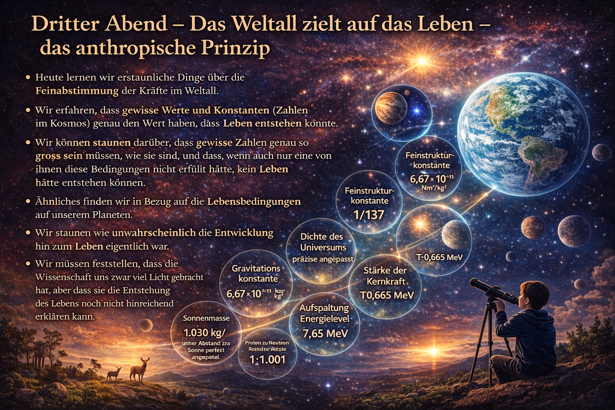 Dritter Abend 17.September 2026 - Das Weltall zielt auf das Leben – das anthropische Prinzip: Heute lernen wir erstaunliche Dinge über die Feinabstimmung der Kräfte im Weltall. Wir erfahren, dass gewisse Werte und Konstanten (Zahlen im Kosmos) genau den Wert haben, dass Leben entstehen konnte. Wir können staunen darüber, dass gewisse Zahlen genau so gross sein müssen, wie sie sind, und dass, wenn auch nur eine von ihnen diese Bedingungen nicht erfüllt hätte, kein Leben hätte entstehen können. Ähnliches finden wir in Bezug auf die Lebensbedingungen auf unserem Planeten. Wir staunen wie unwahrscheinlich die Entwicklung hin zum Leben eigentlich war. Wir müssen feststellen, dass die Wissenschaft uns zwar viel Licht gebracht hat, aber dass sie die Entstehung des Lebens noch nicht hinreichend erklären kann. Wir schauen uns an, wie weit die Suche nach ausserirdischem Leben geraten ist, was Wissenschaftler suchen und was sie gefunden haben.
